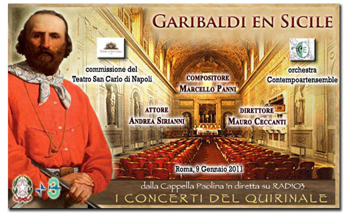 Il concerto - realizzato in occasione dei festeggiamenti per i 150 anni dall'unità d'Italia – è tratto dall'opera Garibaldi en Sicile composta da Marcello Panni su commissione del Teatro San Carlo di Napoli nell' Aprile del 2005. La Grande Suite per 5 strumenti (pianoforte con piccola percussione, flauto, clarinetto/clarinetto basso, violino,violoncello) e voce recitante nel 2011 è commissionata al Contempoartensemble di Firenze diretto da Mauro Ceccanti; I brani eseguiti sono "Aux Armes!", "Chanson d'adieu", "Ricercare nocturne", "Fanfare", "Couplets entrecoupés", "Ode à la Liberté" e "Marche des Chemises Rouges" accompagnti dalla lettura di testi, che fungono da filo conduttore del concerto, quali: "l'Inno di Garibaldi" del 1858 scritto da Luigi Mercantini, "l'Ode alla libertà" e le cronache liberamente ispirate a "Les Garibaldiens" di Alexandre Dumas padre, lettere dal castello di Nohant del 1859 e 1860 di Georges Sand, il discorso tenuto da Victor Hugo nel 1860 al banchetto per la raccolta fondi per la Sicilia dell'isola di Jersey, la corrispondenza di Camillo Benso Conte di Cavour di fine Aprile 1860 e il proclama di Giuseppe Garibaldi del 15 Maggio 1860 dopo la battaglia di Calatafimi. La prima esecuzione CE si svolge all'interno del cartellone Festa della Toscana 2010 nella sala delle feste di Palazzo Bastogi di Firenze. Una tra le numerose repliche del concerto viene eseguita a Roma nella Cappella Paolina di Palazzo Quirinale, con diretta radiofonica su Radio3 per i concerti del Quirinale, alla presenza di Giorgio Napolitano, Presidente della Repubblica Italiana.