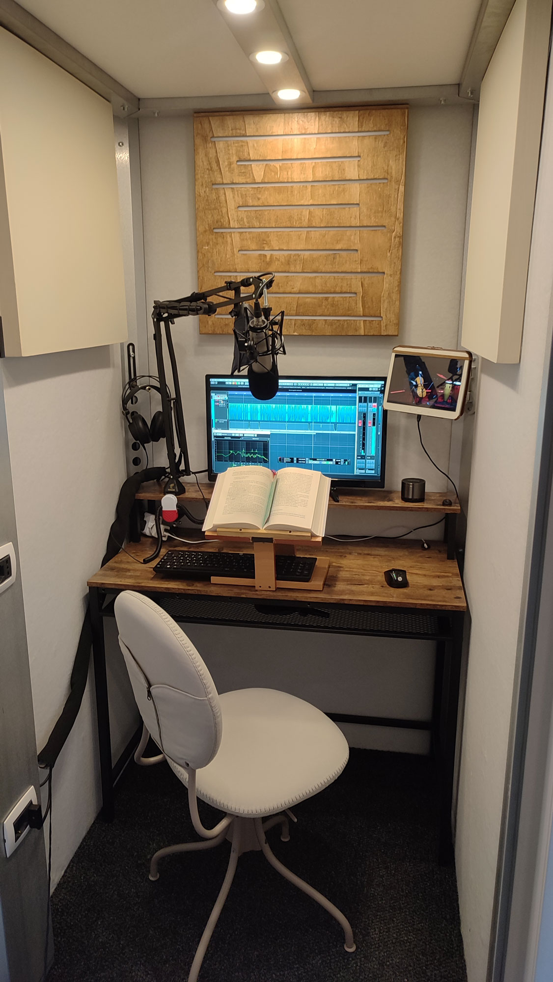 La cabina di registrazione è realizzata con pavimento flottante ammortizzato e spesse pareti fonoassorbenti per un totale isolamento acustico con l'ambiente esterno.